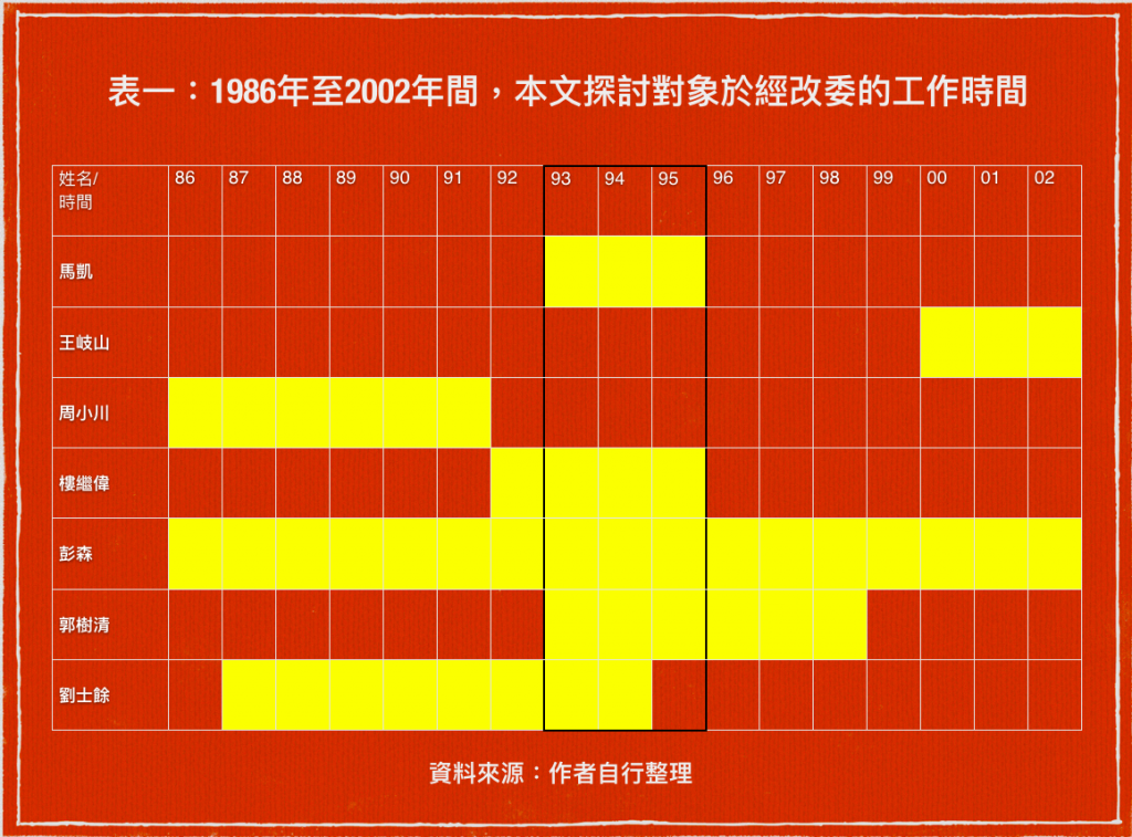 爾後投身學界者,如張維迎、曹遠征、華生、石小敏等人,至今都是影響力不小的經濟學家,也都曾在經改委工作過,儘管他們後續不在政治崗位上,也都透過學術界的威名發揮影響力。本文將這些幹部在經改委的工作時間,以甘特圖的方式呈現,如表一所示,除了王岐山與周小川二人往銀行系統任職以外,其他幹部在1993年至1995年有大量的重疊,共事關係明顯。而1993年恰好又接在鄧小平南巡後,中共進入社會主義市場經濟的全面推進階段,是這群年輕的經濟官員大顯身手的好時機。