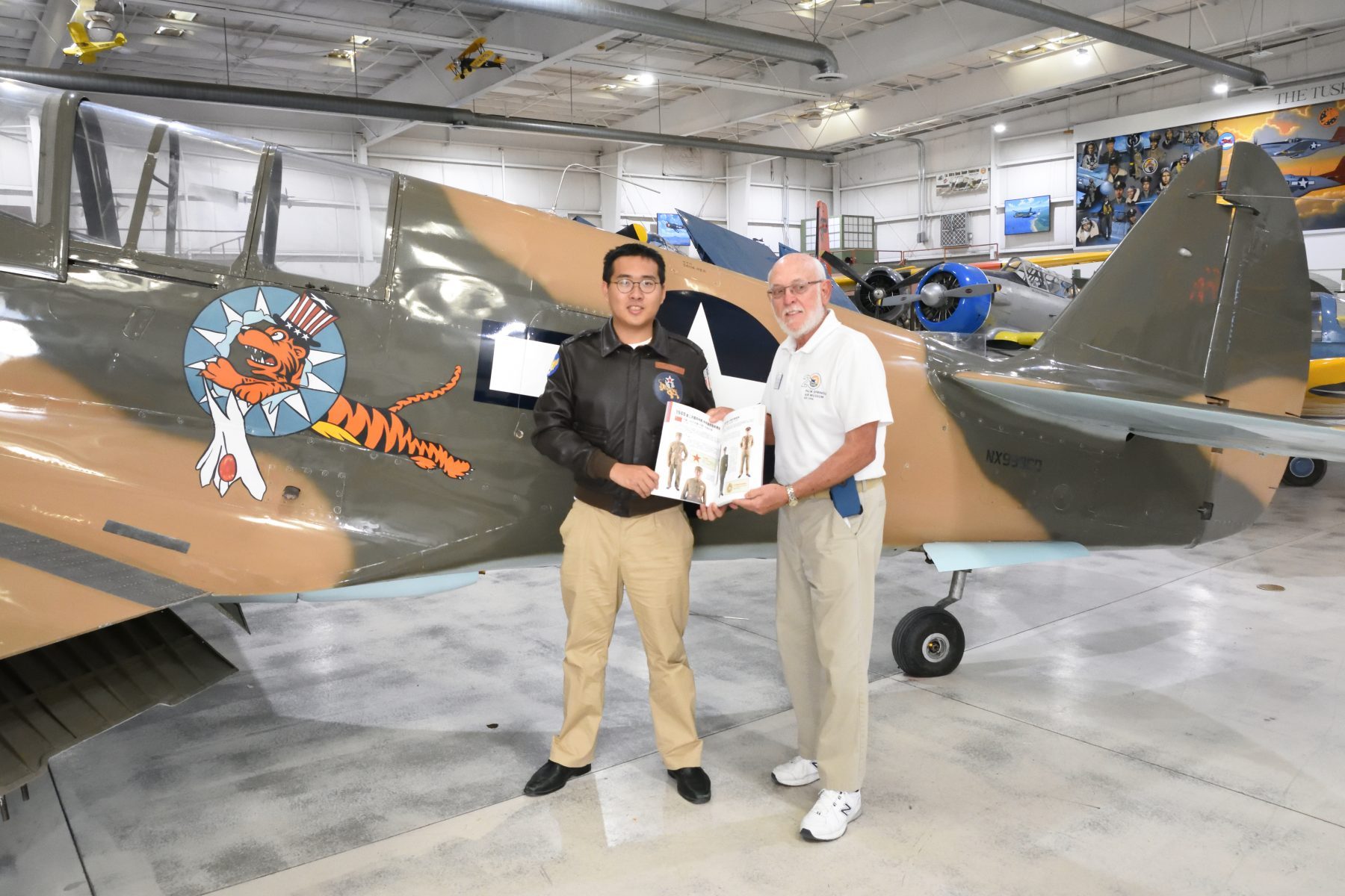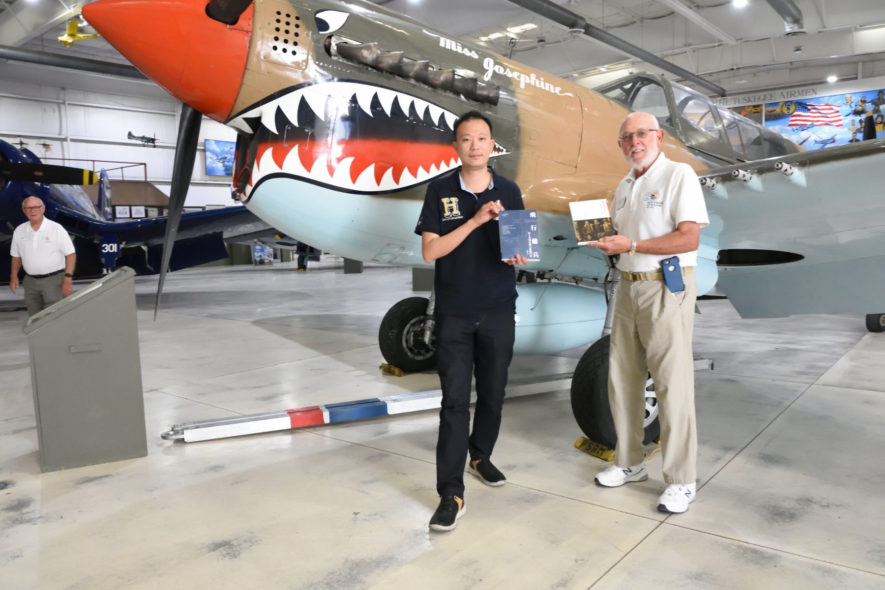 除了語言之外,他表示書籍的題材亦不受限制,只要與軍事歷史有關就可以了。所以吳尚融的《中國百年陸軍軍服1905∼2018》雖然是以地面部隊為主,但仍受到法蘭克的歡迎。筆者提議,希望能夠在棕櫚泉航空博物館的展品前舉辦一個簡單的捐書儀式,法蘭克很豪爽的就答應了。既然我們捐的書籍,都與二戰中國有關,那麼合影的地方就選在館裡收藏的P-40戰鬥機前面。