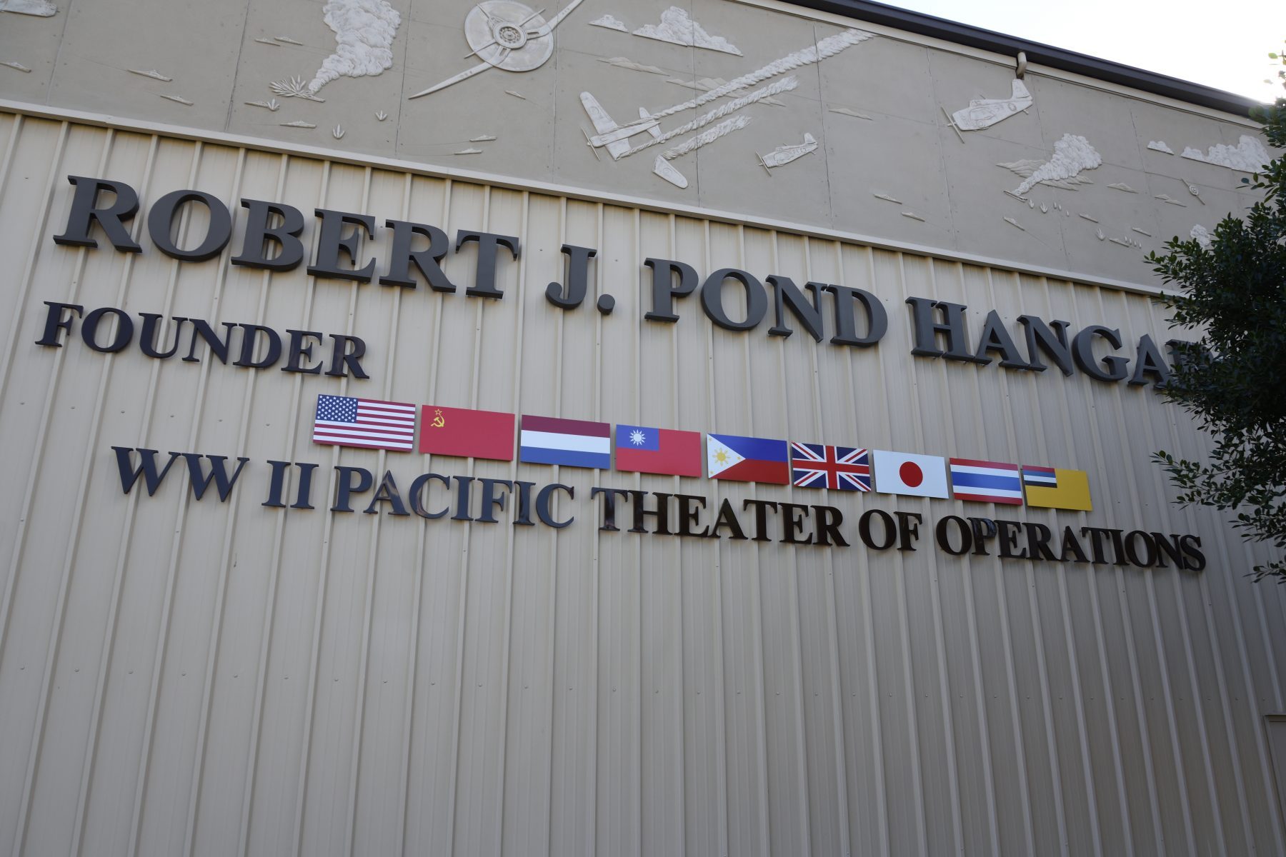 其中以博物館創辦人龐德(Robert J. Pond)命名的太平洋戰爭館,就在建築物外擺上了美國、蘇聯、荷蘭、中國、菲律賓、英國、日本、泰國與滿洲國等九個參戰國國旗,前六個為同盟國,後三個為軸心國,包括日軍扶持的傀儡政權滿洲國。二戰時代表中國參加反法西斯戰爭的為國民政府,所以這裡呈現的中國國旗理所當然是青天白日滿地紅。